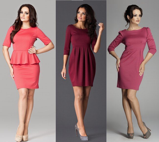 Pentru tinute ceva mai elegante, pentru femeile ce preefera stilul smart casual, recomand rochiile cu fusta creion, care evidentiaza silueta, potrivindu-se si persoanelor ceva mai plinute. Pentru mascarea coapselor mai pline sau a burticii, alegeti modele de rochii cu peplum. Peplumul este volanul acela clos cusut in talie, care cade frumos peste coapse si burta si le mascheaza (prima rochie corai de mai sus). Puteti opta de asemenea, pentru rochii cu talie inalta, cu falduri sau nu, in talie (modelele 2 si 3 de mai sus, rochiile bordo si fucsia). Asortati pantofi cu platforma bej sau gri.
