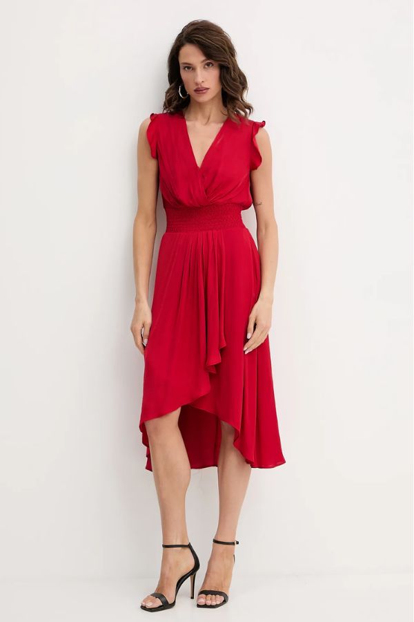 Această rochie roșie este o alegere îndrăzneață și elegantă, perfectă pentru evenimente de vară cu un aer sofisticat. Cu un decolteu adânc în V și mâneci cu volane, rochia adaugă un plus de dramatism și feminitate. Talia este accentuată printr-un detaliu smockat, care oferă confort și structură, iar fusta asimetrică, mai scurtă în față și mai lungă în spate, creează un efect fluid și spectaculos în mișcare. Este ideală pentru petreceri de seară, cocktailuri sau ocazii speciale unde vrei să ieși în evidență.