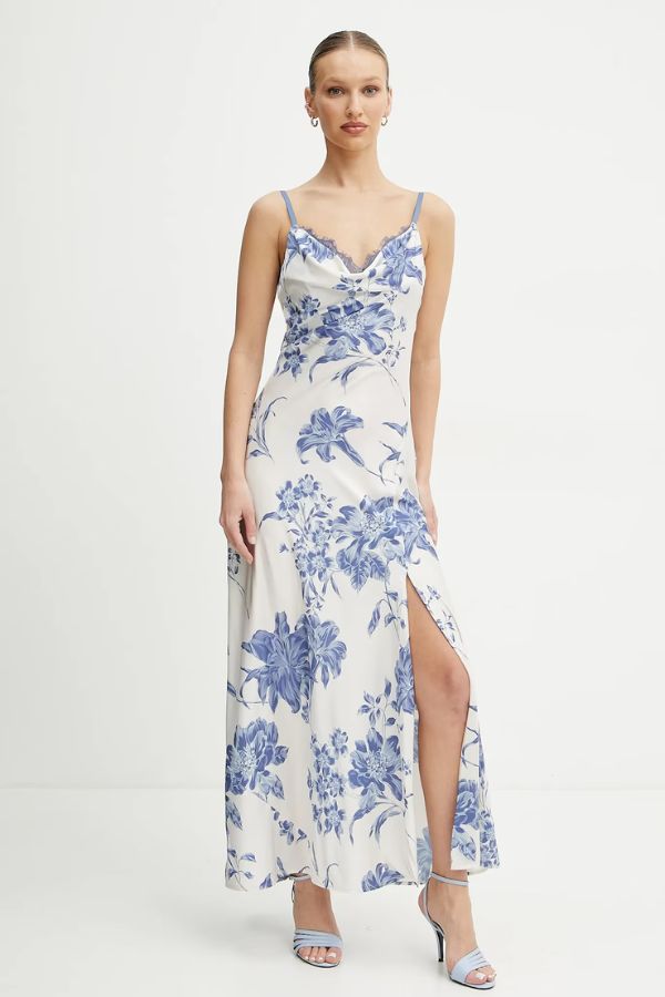 Această rochie lungă, fără mâneci, cu bretele subțiri și imprimeu floral albastru pe fond alb este o alegere rafinată și răcoritoare pentru vară. Croiala lejeră și fanta laterală adaugă un aer senzual și relaxat, perfect pentru plimbări pe malul mării sau evenimente estivale. Imprimeul floral delicat și sandalele albastre cu toc completează un look feminin, proaspăt și ușor de purtat în zilele călduroase.