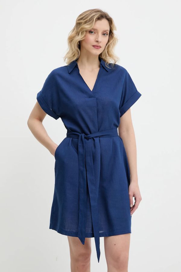 Această rochie verde deschis este o piesă versatilă și proaspătă, ideală pentru zilele călduroase. Cu un decolteu în V, mâneci scurte și nasturi pe toată lungimea, rochia are un aer casual-elegant. Talie este accentuată de o bandă lată texturată, care oferă structură și subliniază silueta. Lungimea până la gambă și croiala lejeră o fac potrivită atât pentru birou, cât și pentru ieșiri relaxate în oraș.