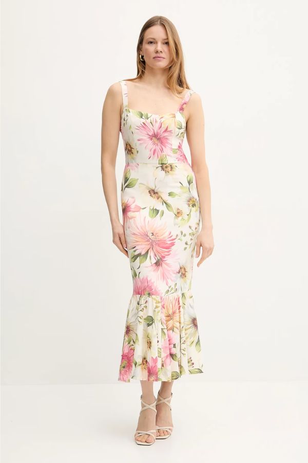 Această rochie fără mâneci, cu imprimeu floral în nuanțe de roz și alb pe fundal deschis, este o alegere feminină și vibrantă pentru ocazii estivale. Croiala cambrată pune în valoare silueta, iar decolteul pătrat adaugă un aer clasic și elegant. Volanul amplu de la bază oferă mișcare și un plus de rafinament, transformând rochia într-o piesă ideală pentru petreceri în grădină, cine romantice sau evenimente de zi.