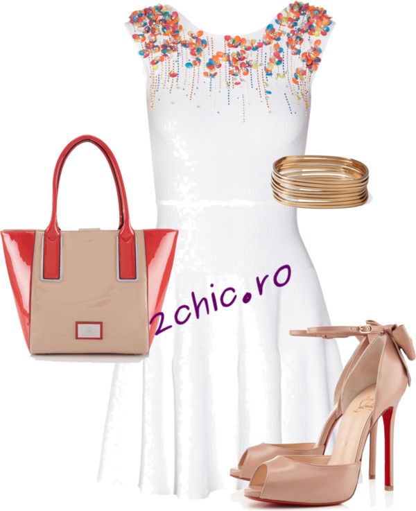Rochie alba cu flori la baza gatului asortata cu geanta, bratari si pantofi coral