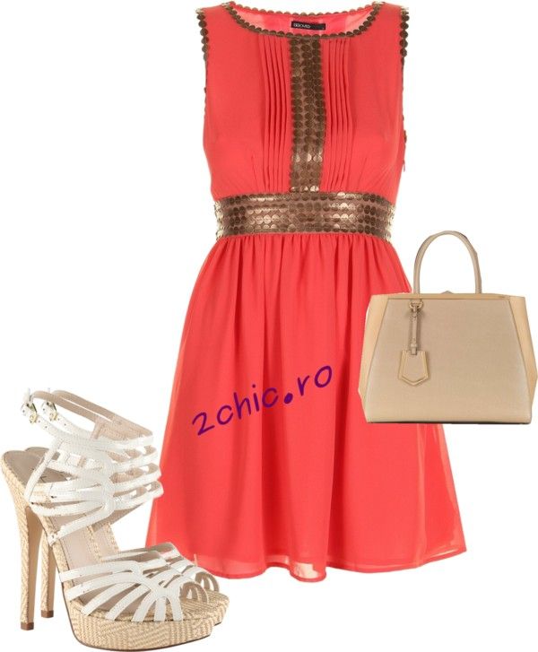 Rochie corai cu elemente romane, asortata cu sandale albe si geanta bej-crem