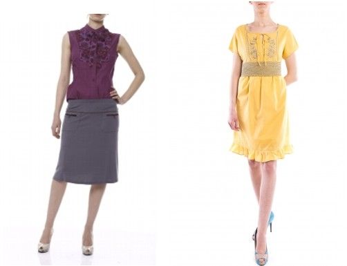 Bluza violet cu platca imprimata si guler-funda; Rochie- ie galbena cu platca brodata