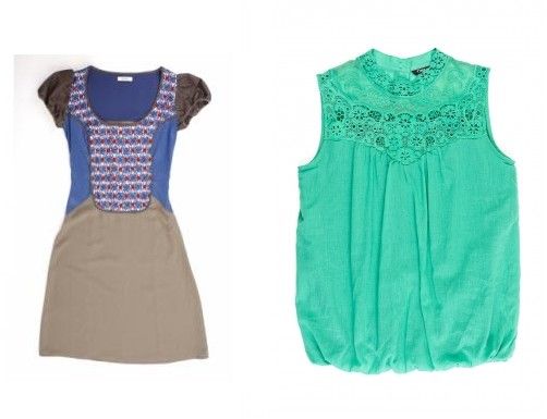 Rochie bej cu platca flori albastre si rosii; Bluza verde cu platca din dantela florala