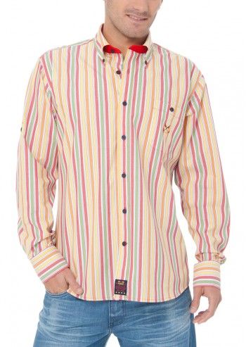 – camasa realizata din material alb cu model in dungi verticale, colorate in roz somon, albastru bleumarin, rosu inchis si galben sofran