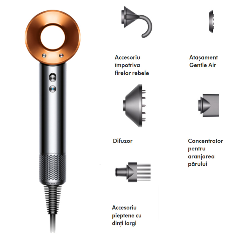 Uscătorul funcționează la o putere scăzută de 1600 W, demonstrând că mai mult nu înseamnă întotdeauna mai bine. Experiența utilizatorului este impresionantă; cu tehnologia Supersonic, are trei comenzi de viteză, patru de căldură și un buton de injectare la rece. Zboară viteză maximă fără timp de încălzire și este unul dintre cele mai silențioase uscătoare de păr, ușor de control al motorului dintre mâner. Duzele se atașează magnetic.