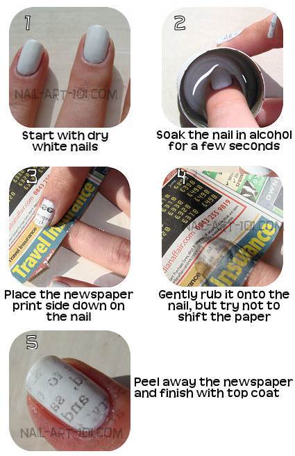 1. Incepeti prin a va face unghiile cu lac alb; lasati sa se usuce bine. 2. Introduceti pe rand cate un deget in alcool (sanitar) cateva secunde. 3. Aplicati o bucata de ziar pe unghie. Aveti grija s aplicati scrisul, nu o parte alba sau poza. 4. Cu grija frecati si apasati bine ziarul pe unghie dar fara a-l deplasa. 5. Ridicati ziarul, lasati sa se usuce si aplicati un strat de lac incolor.