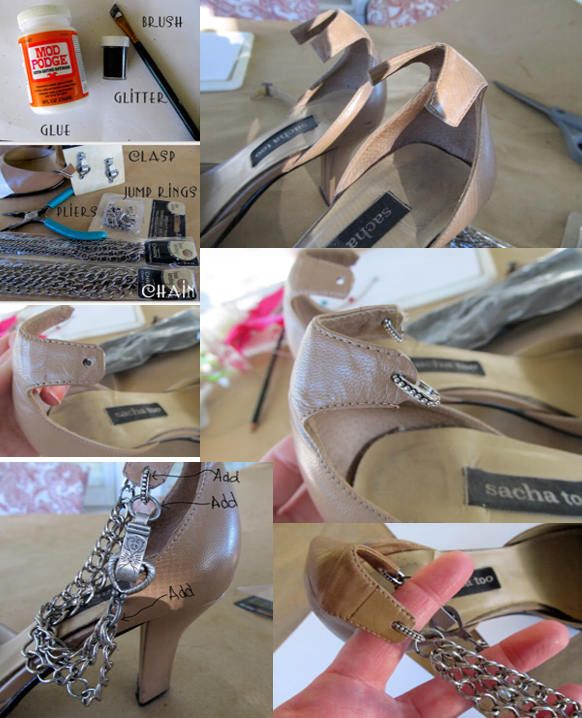 Poti aduce si alte modificari: colorarea varfului, tocului. Foloseste glitter (negru, argintiu) si adeziv si aplica pe varf si pe toc. Dupa uscare, poti trasa o linie cu glitter de lata culoare pe varf ca sa imbunatatesti aspectul. Pentru barete iti trebuie lant si zale, plus inchizatoare. Lantul il poti pune in 2 sau 3 depinde cum iti place.