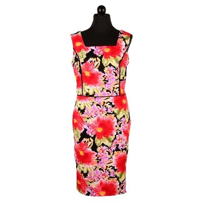 Rochie eleganta cu imprimeu floral. Aceasta rochie are un decolteu drept, croiala este pe linia corpului, fiind evidentiata intr-un mod foarte feminin si frumos talia prin bie-ul negru – 149 lei