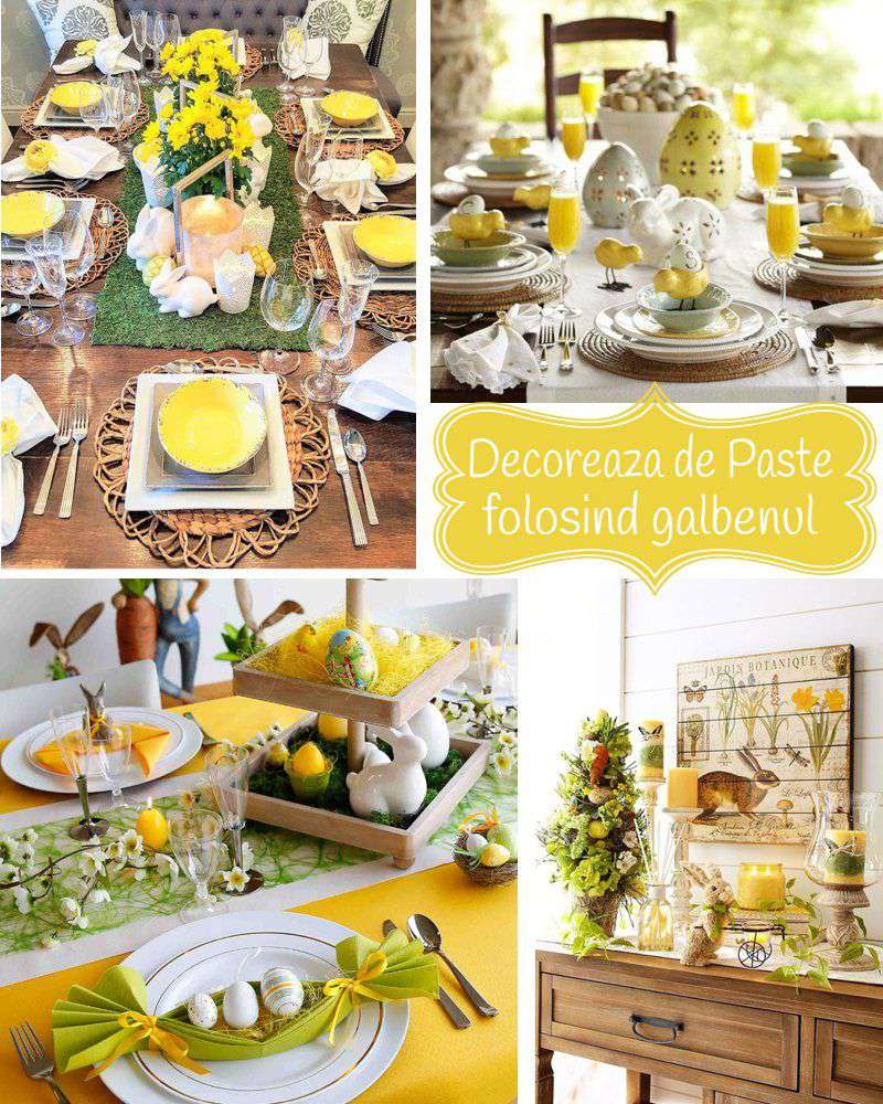 Masa de Paști va fi minunată pentru prezentarea servetelor galbene și a ouălor de Paște. De asemenea, merită să vă orientati dupa ornamente de porțelan in nuanta soarelui, care pot fi așezatt pe o fata de masa alba. În bucătărie, cu toate acestea, puteți ține cont doar de gusturile dvs. ca sa obtineti un spatiu placut, plin de viata, sa va faca placere sa petreceti timp gatind.