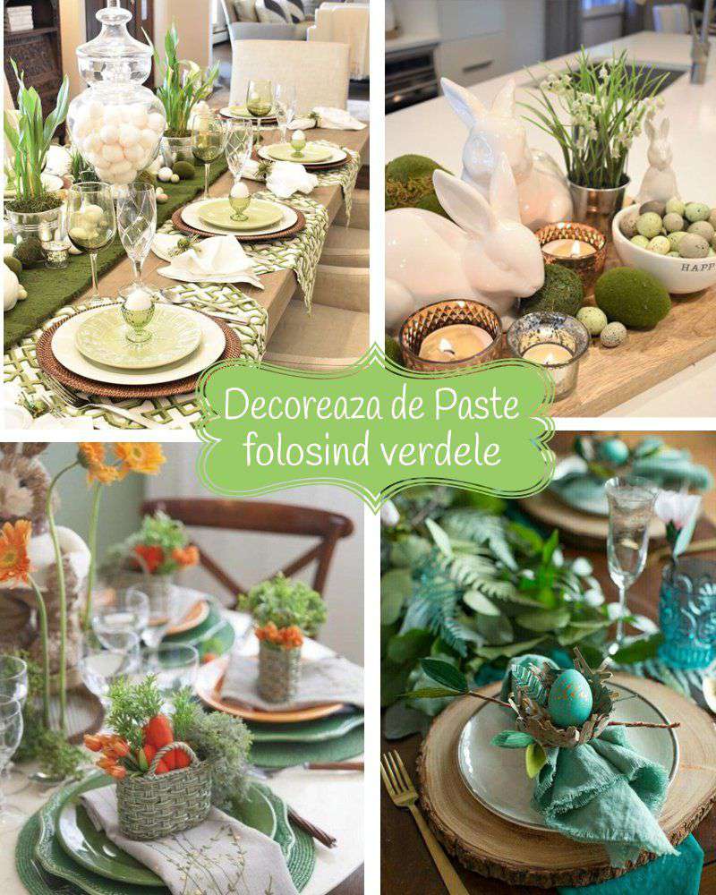 Verdele este culoarea primăverii și a speranței. Este asociat cu renasterea si natura, si in acelasi timp are un impact deosebit asupra oamenilor – relaxeaza si calmeaza nervii. Decorurile verzi de Paști vor intensifica cu siguranță locuința și vor îmbunătăți bunăstarea noastră. Această culoare poate fi pusă pe o față de masă, de exemplu, cu mușchi imprimat, pe tacamuri sau cu iepuri decorativi din lemn și porțelan. La rândul său, bucătăria ar fi minunat să prezinte o forma de tort verde, exact pentru produse de patiserie de Paște. Un ornament interesant poate fi și un coș de simț în această culoare, care seamănă cu urechile de iarbă. Lumânările și sfeșnicele cu motive verzi sunt, de asemenea, invariabil bune.
