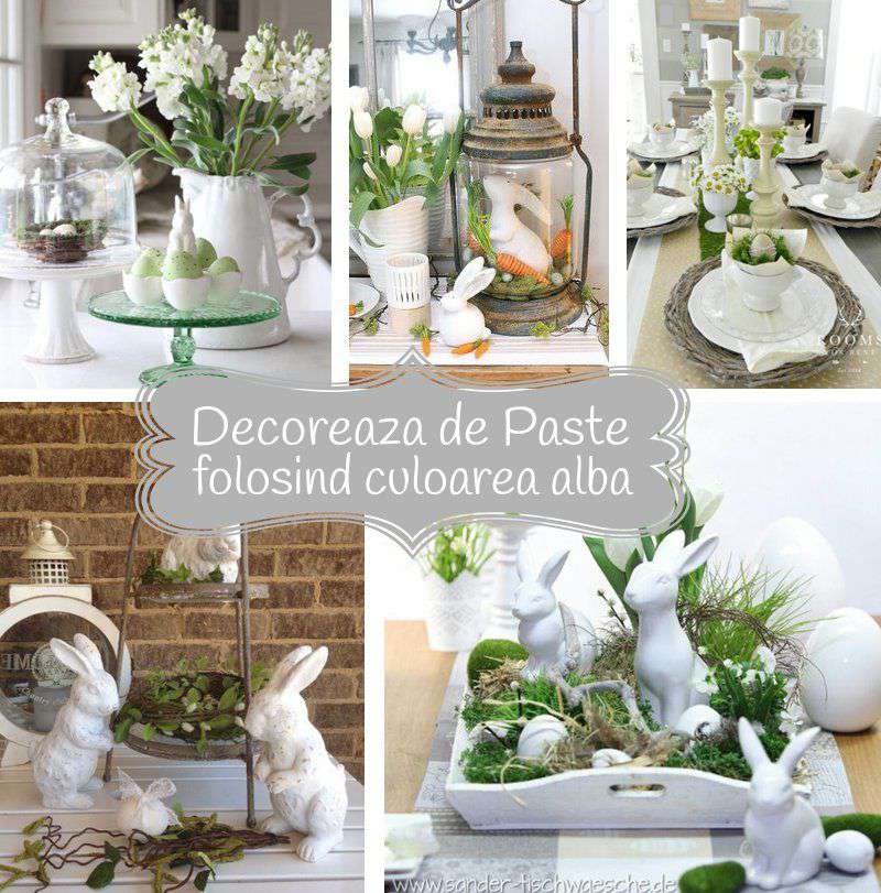 Albul este clasic și elegant. Această culoare este întotdeauna în vigoare, pentru că este atemporală. Simbolizează puritatea și inocența, care sunt caracteristicile Paștelui. Decoratiile de Paste albe sunt foarte usor de a aduce acasa, pentru ca se amesteca bine cu toate culorile si stilurile. Căutând decorațiuni albe pentru Paste, merită să începeți cu o față de masă. Ajungem la el aproape în fiecare Paste și este greu să fii surprins. Este o bază ideală.