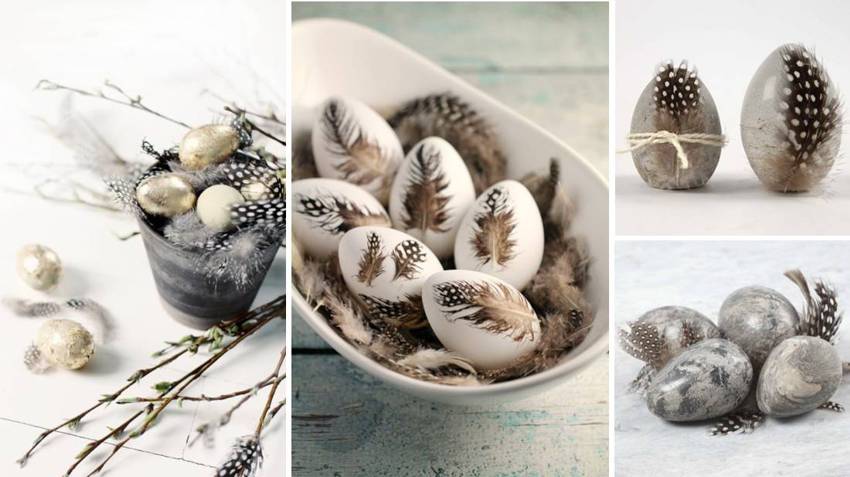 Daca nu sunteti foarte indemanatici folositi doar cateva vopsele, poate chiar mai speciale, gen auriu sau cu efect de marmura si pene colorate si lipici pentru a abtine un castron cu oua deosebite ca decor de primavara si Paste. Penele pot fi folosite si la decorare de crengute sau asezate pe fundul platourilor cu oua, ca cuib.