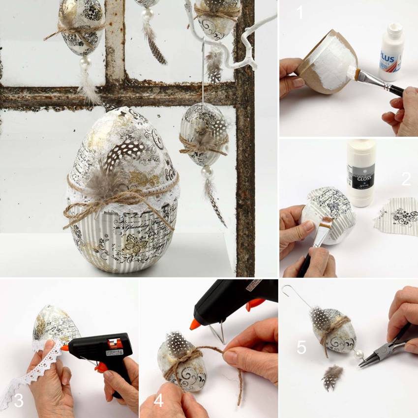 Pentru cei mai indemanatici aceste ghirlande de oua model decupaj cu pene vor fi exact ce le trebuie pentru a-si arata maiestria. Pasii sunt usor de urmat. Folositi un ou de carton ce se desface (in care puteti pune cateva bomboane) pe care ilcolorati cu vopsea alba acrilica. Cat se usuca, decupati din hartie specifica sau servetele cu model, bucati pe care le lipiti apoi cu gel depupaj pe ou.. aplicati si deasupra ca un lac. Luati apoi pistolul cu lipici si lipiti dantela, sfoara sau snururi colorate, impreuna cu penele ca in pasii 3-4. La sfarsit introduceti sarma si folosind bucle decorati cu margele si pene si prindeti ouale unul dupa altul.