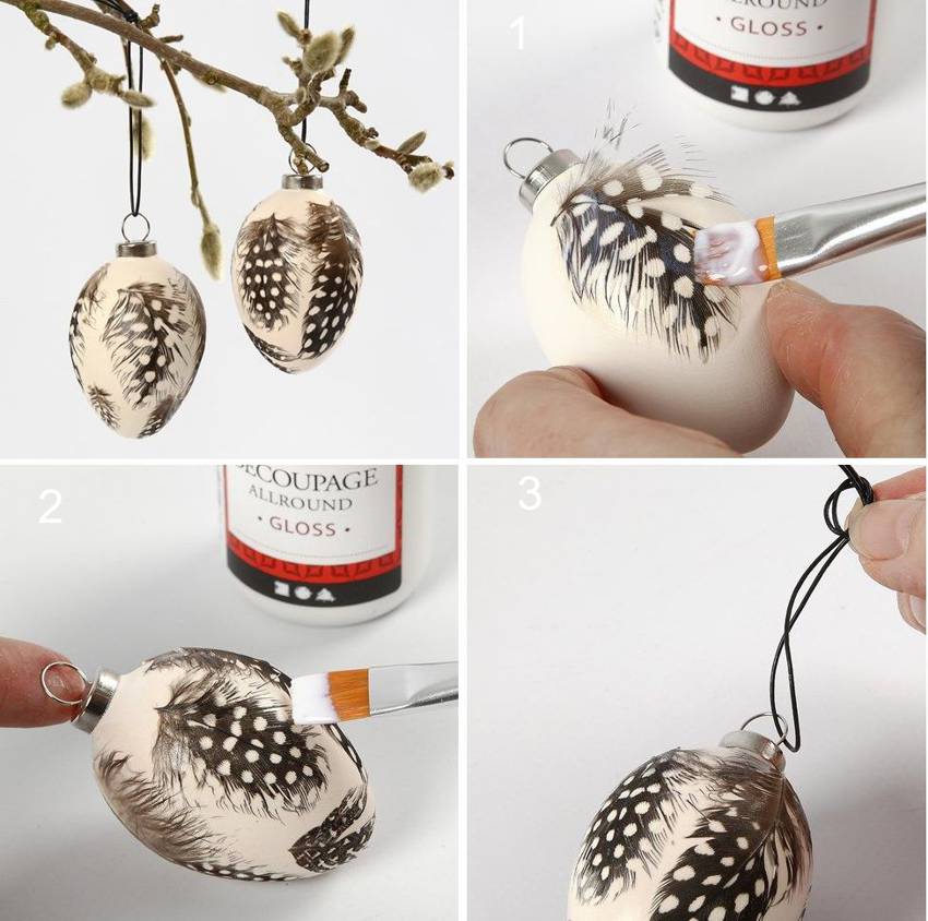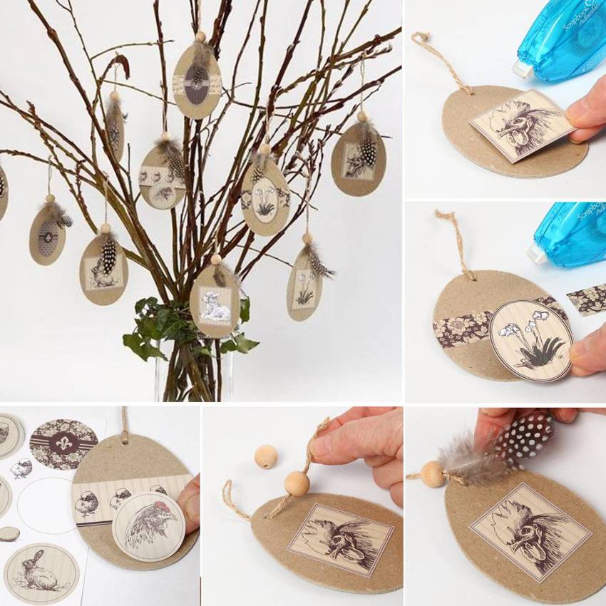 Ce e mai usor decat decorarea unui mic copac sau crengute cu oua pentru Paste? Sa incercam o varietate de oua handmade dar plate, din carton pe care lipiti hartie decupata anterior cu modele de sezon (sau servetele imprimate) si lipici pentru decupaj. Finisati si deasupra cu lipiciul pentru ca e transparent si actioneaza ca un lac. Aceste oua cu pene se lucreaza foarte repede si usor si pot fi implicati si copiii. Puteti face si ghirlande la fel, dar gauriti oul si in partea jos, pe unde veti trece sfoara.