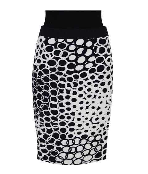 Fusta midi creion cu imprimeuri geometrice in alb si negru. O poti purta cu o camasa stramta alba sau neagra si pantofi rosii cu toc inalt.