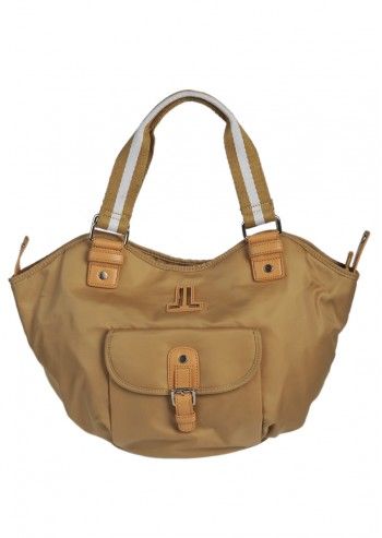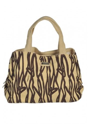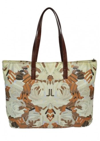 – geanta casual realizata din material textil de culoare bej, cu model abstract in nuante de maro