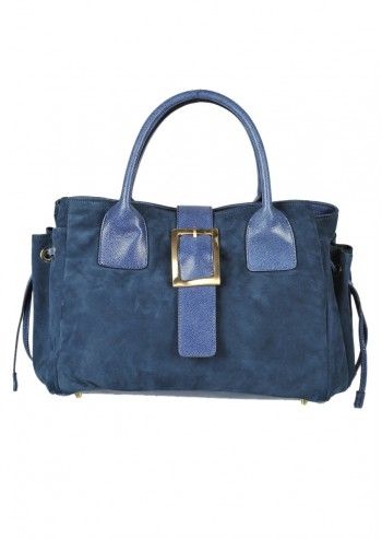 Geanta elegant-chic realizata din piele intoarsa catifelata de culoare bleumarin, prevazuta cu doua barete fixe si inchidere cu clapa si sistem metalic. Geanta este ajustabila cu snururi de piele in laterale si are un design extrem de practic si ergonomic. Catarama aurie aplicata frontal ii imbogateste forma si ii adauga o nota inconfundabila de stil si eleganta.
