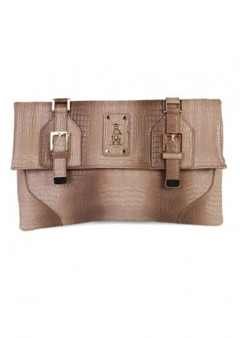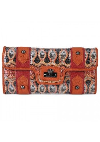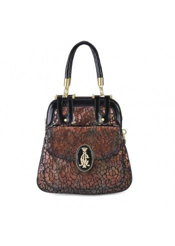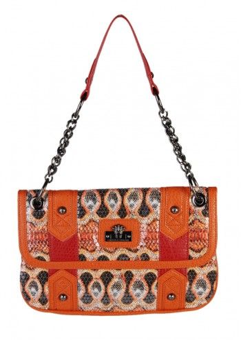 Aceasta geanta de umar este realizata dintr-un material in nuante de maro, oranj si rosu care imita pielea de sarpe. Este prevazuta cu o bareta scurta realizata dintr-un lant metalic si se inchide cu o clapeta. Geanta este prevazuta cu paiete transparente, are tinte metalice decorative si un element metalic pe care este stantat numele brandului.