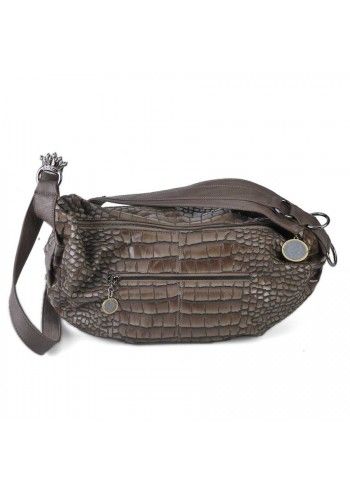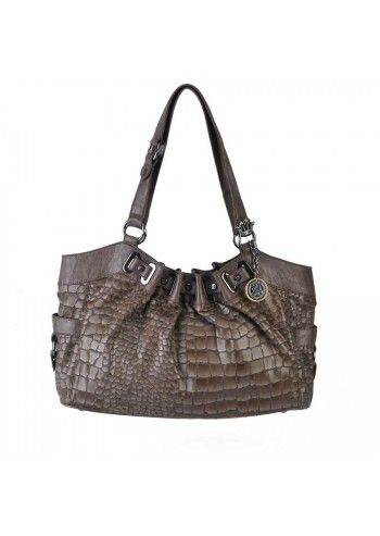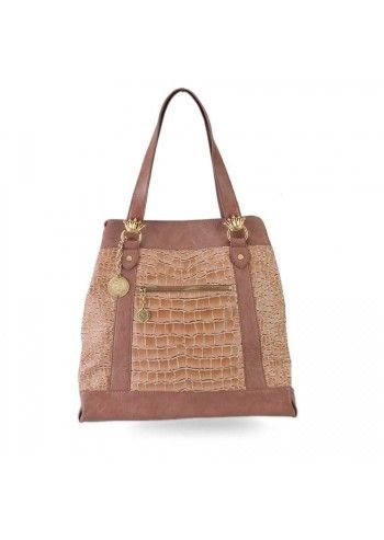 Geanta ampla de culoare maro, realizata dintr-un material texturat ce imita pielea de crocodil, prevazuta cu o bareta ajustabila pentru umar si inchidere cu fermoar in partea superioara. Geanta este completata de anouri decorative si pandantive chic la nivelul fermoarelor.