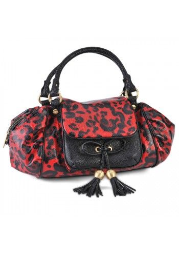 Geanta de umar, realizata din imitatie de piele rosie, imprimata cu model leopard negru. Este decorata cu o funda din material negru, accesorizata cu franjuri si bile metalice aurii, gravate cu logo-ul Christian Audigier. Geanta se inchide cu fermoar si clapeta magnetica.
