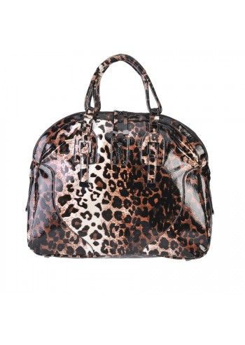 Geanta supradimensionata, realizata din imitatie lucioasa de piele, imprimata cu model leopard in nuante de bej, maro, cupru si negru. Este decorata cu catarame metalice si se inchide in partea superioara cu fermoar bidirectional.