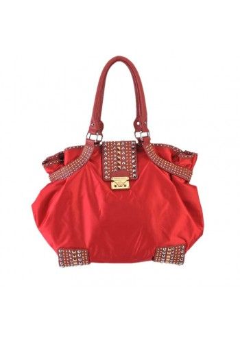 Geanta eleganta stil tote, realizata din material sintetic impermeabil de culoare rosie, cu design plisat lateral, decorata cu detalii pe margine din imitatie de piele de culoare rosie, ornate cu tinte metalice aurii si argintii. Geanta este prevazuta cu doua barete de umar si se inchide cu o capsa magnetica in interior si o clapeta magnetica in exterior, decorata cu tinte.