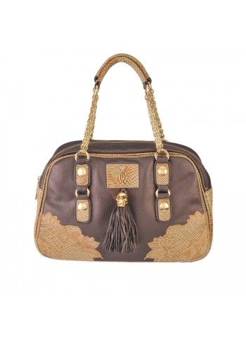 Geanta foarte eleganta si extravaganta in nuante de maro si auriu, prevazuta cu doua manere fixe, nituri metalice decorate cu logo, un craniu decorat cu pietre stralucitoare si inchidere cu fermoar in partea de sus.