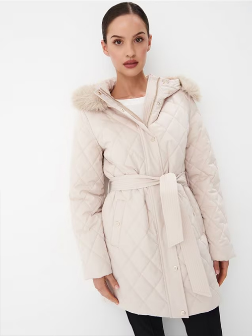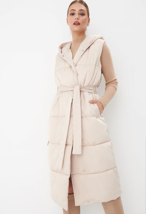 Vestă matlasată lungă bej ivoire cu cordon în talie – vezi preț