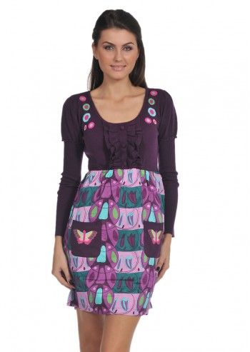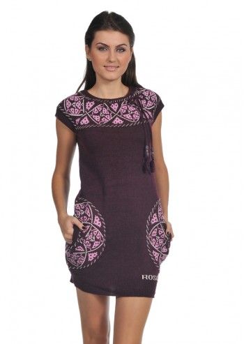 Rochie violet tyrian perfecta pentru zilele racoroase, prevazuta cu un decolteu rotund, ajustabil cu un snur, decorat cu un model tricotat in nuante de roz si alb, maneci scurte si doua buzunare spatioase pozitionate pe partea de jos a rochiei.