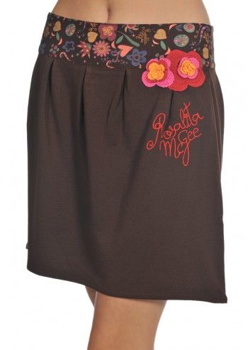 Fusta scurta, maro ciocolatiu, foarte chic, prevazuta cu o bata lata cu un imprimeu floral colorat, aplicatii decorative, pliuri in partea din fata si inchidere cu fermoar in lateral.