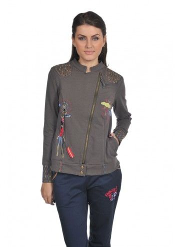 Hanorac gri cu maneci lungi, decorat pe umeri cu detalii metalice, prevazut cu un guler tunica, inchidere cu fermoar pe partea din fata si un imprimeu brodat colorat. In partea de jos se inchide cu doua capse si prezinta doua buzunare.