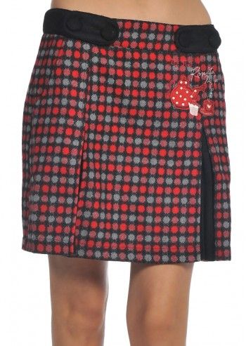 Aceasta fusta este realizata dintr-un material in buline rosii si gri. In talie este prevazuta cu o banda neagra si un set de cate doi nasturi, are doua buzunare laterale si este prevazuta cu o broderie decorativa. Se inchide la spate cu un fermoar, iar pe partea din fata are doua falduri chic.