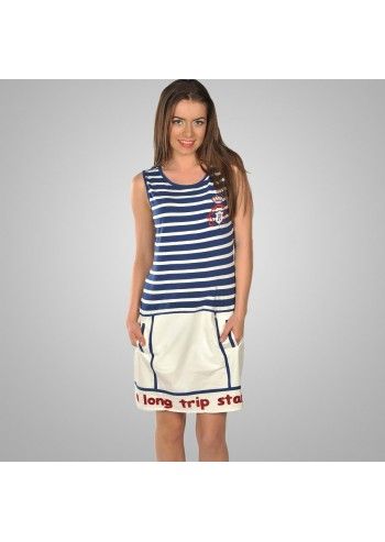 Sarafan vesel, croit dintr-un material in nuante de bleumarin si alb, cu dungi marinaresti in partea de sus si o inscriptie rosie cu mesaj la terminatii. Este imbogatit cu o emblema in partea de sus, completata de o insertie cu paiete. Are buzunare sub nivelul taliei, si decolteu rotund, la baza gatului.