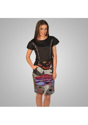 Rochie neagra cu o croiala lejera usor in A, cu maneci incretite, cu decolteu rotund, tinte metalice, imprimeu colorat in nuante de mov, albastru si portocaliu si o curea detasabila in jurul taliei. Este prevazuta cu un fermoar de inchidere in partea din spate.