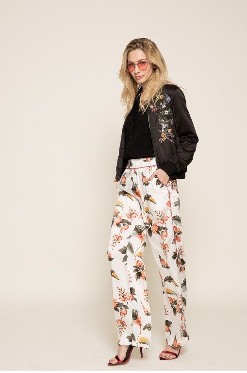 Cel mai usor sa porti un pantalon cu flori e sa-l combini cu un top ceva mai lung, culori neutre, eventual cu un cuvant imprimat, dar nu incarcat. Acesta e un look relaxat si puteti adauga balerini, tenisi sau pantofi cu toc mai mic, confortabili. Daca nu stici ce top sa alegeti, optati pentru neutru – alb, gri, negru. Orientati-va sa fie o culoare din imprimeul pantalonilor. Merge si o jacheta de blugi sau scurta din piele intoarsa (artificiala).