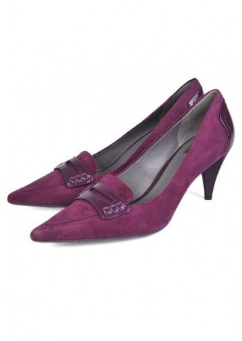 Pantofi realizati din piele intoarsa, de culoare violet aubergine, decorati in zona varfului si a calcaiului cu aplicatii din piele lacuita in aceeasi nuanta, cateva cusaturi fine si logo stantat. Sunt prevazuti cu varf ascutit, talpa aderenta si toc mediu fatetat, gravat cu numele brandului.