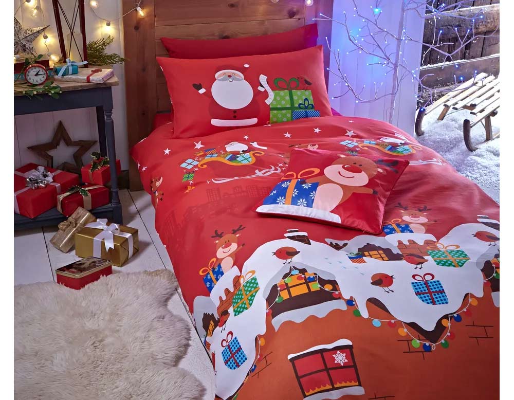 Lenjerie de pat cu Moș Crăciun. Nimic nu strigă “A venit Crăciunul!” mai tare ca o lenjerie de pat cu Moș Crăciun, chiar și într-un dormitor pentru adulți. Va fi un accent vesel care va crea o atmosferă de sărbătoare, cu siguranță.