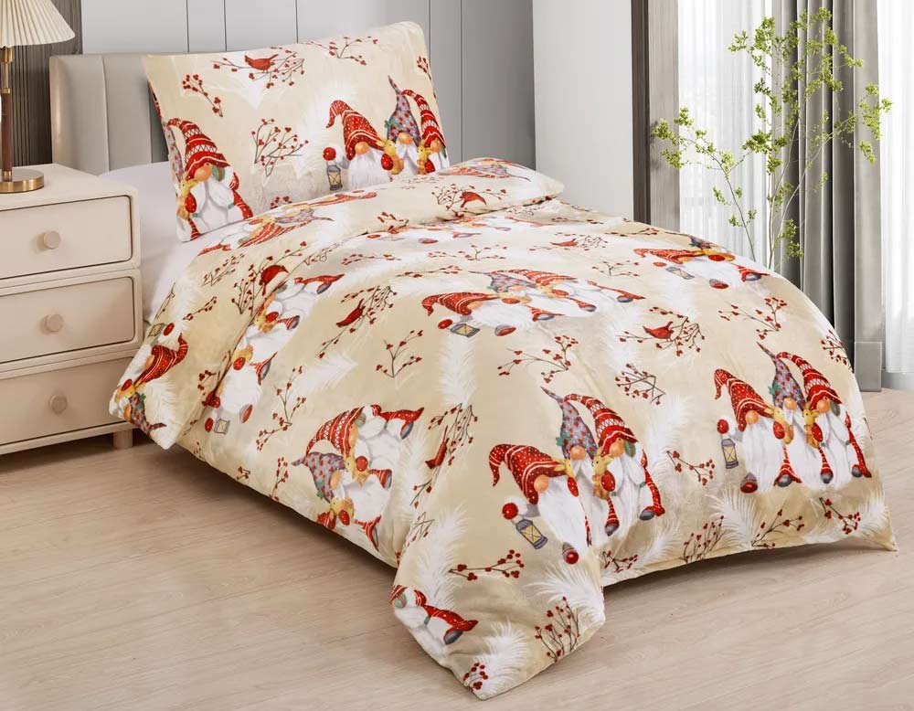 Lenjerie de pat de Crăciun cu gnomi. Spiridușii sunt un motiv popular de Crăciun în țările nordice. Uneori sunt răutăcioși și joacă feste în Ajunul Crăciunului, uneori sunt de ajutor și lasă cadouri împreună cu Moș Crăciun. Sunt un motiv decorativ excepțional de grațios.
