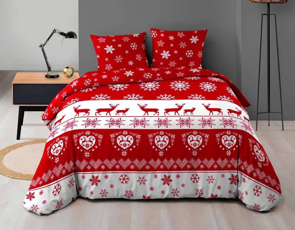 Lenjerie de pat de Crăciun în stil scandinav. Seturile inspirate din stilul scandinav au modele mai structurate, motive care se repetă, de exemplu, renul și o paletă de culori restrânsă. Cu siguranță sunt mai ușor de încorporat în amenajările de dormitoare moderne și minimaliste.