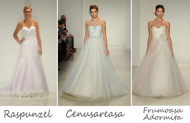 Culori vibrante ca rosu si indigo se impletesc cu tonuri subtile de roz pudrat, albastru de gheata si auriu in rochiile de mireasa dar exista si culori clasice ca alb si ivoriu. Designerul a prezentat si rochii pentru fetitele cu flori, inspirate de aceleasi personaje Disney.