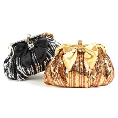 Poti alege aceste posete elegante din material plisat cu funda mare decorata cu strasuri (cristale) pe care le poti asorta la o rochie neagra simpla.