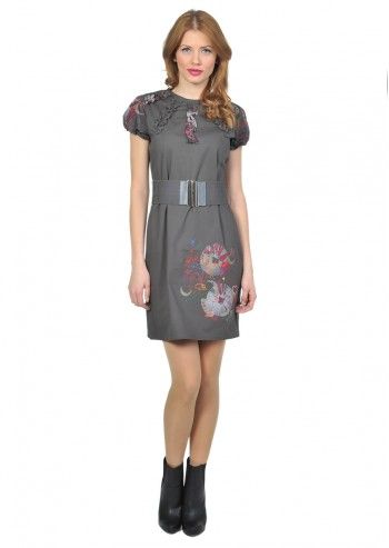 – rochie chic de culoare gri, cu imprimeu fantezie multicolor