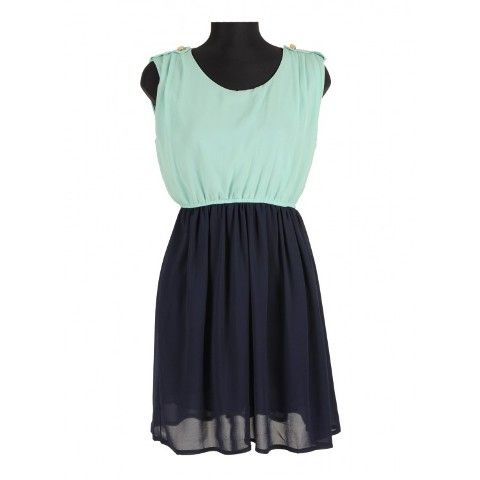 Rochie casual vara din voal in culori. Partea de sus este din voal bleu pastel cu decolteu rotunjit si epoleti cu pense sub epoleti. Partea de jos este din voal bleumarin si este prinsa de parte superioara printr-o taietura elastica in talie.