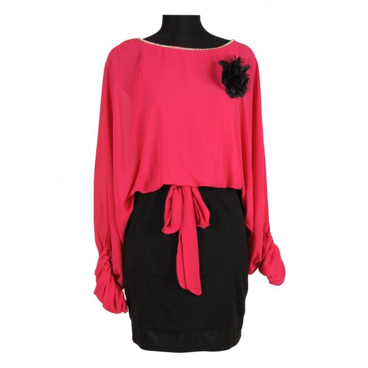 Rochie zi ciclame cu o combinatie de materiale. Partea de sus este ciclame cu un decolteu rotunjit si pense, iar pe spate are un fermoar cusut la vedere. In talie are o banda de 4 cm turcoaz iar partea de jos este dintr-un material imprimat. Este prevazuta cu captuseala. Modelul rochiei este potrivit pentru o tinuta de zi eleganta ce pune in evidenta silueta.