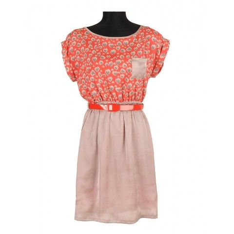Rochie vara satinata in 2 culori Partea de sus este din voal orange cu imprimeu bej cu decolteu rotunjit si maneca usor lasata. Partea de jos este din voal satinat bej si este prinsa de parte superioara printr-o taietura elastica in talie. In talie are o curea rosie lacuita. Modelul este pentru o tinuta casual de vara.