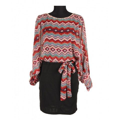 Rochie club sau seara cu voal imprimat. Maneca lunga model fluture cu manseta incretita si patru nasturi. Partea de sus este din voal imprimat si are captuseala maieu. Partea de jos este din tricot elastic si cusaturi orizontale. Decolteu barcuta si cordon talie.