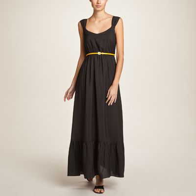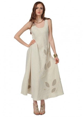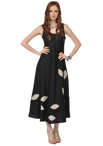 Rochie lunga, lejera, realizata din material de culoare neagra. Rochia are o croiala ampla, evazata si este prevazuta cu decolteu rotund si bretele late. Este accesorizata in partea de jos cu aplicatii decorative cusute, realizate din material de culoare bej. Compozitie 100% in