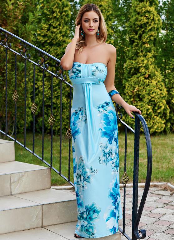 Rochie lunga bleu cu flori, fara bretele, mulata pe piept si solduri cu un fald in fata vezi pret